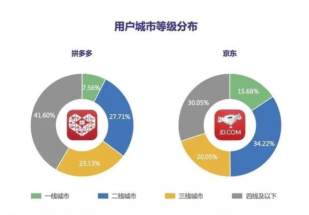 解读:先附上一张统计图,就是拼多多与京东战场阵地的对比图,可以说在4线城市以下,拼多多优势明显;农村包围城市路线很明显,国内广阔的市场有待开发,所以很多玩拼多多店铺的朋友说拼多多不容易玩了,我觉得定论太早,资本的进入意味着市场的继续扩张。